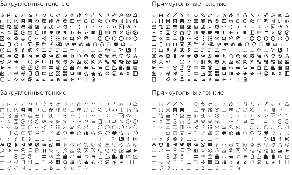 Мы разработали 4 новых набора иконок, каждый из которых получил множество новых иконок. В выборе иконок вы можете определиться с толщиной линий и стилем: закругленные или квадратные. Это сильно поможет вам в стилизации своего сайта, давайте посмотрим на 4 новых набора иконок: